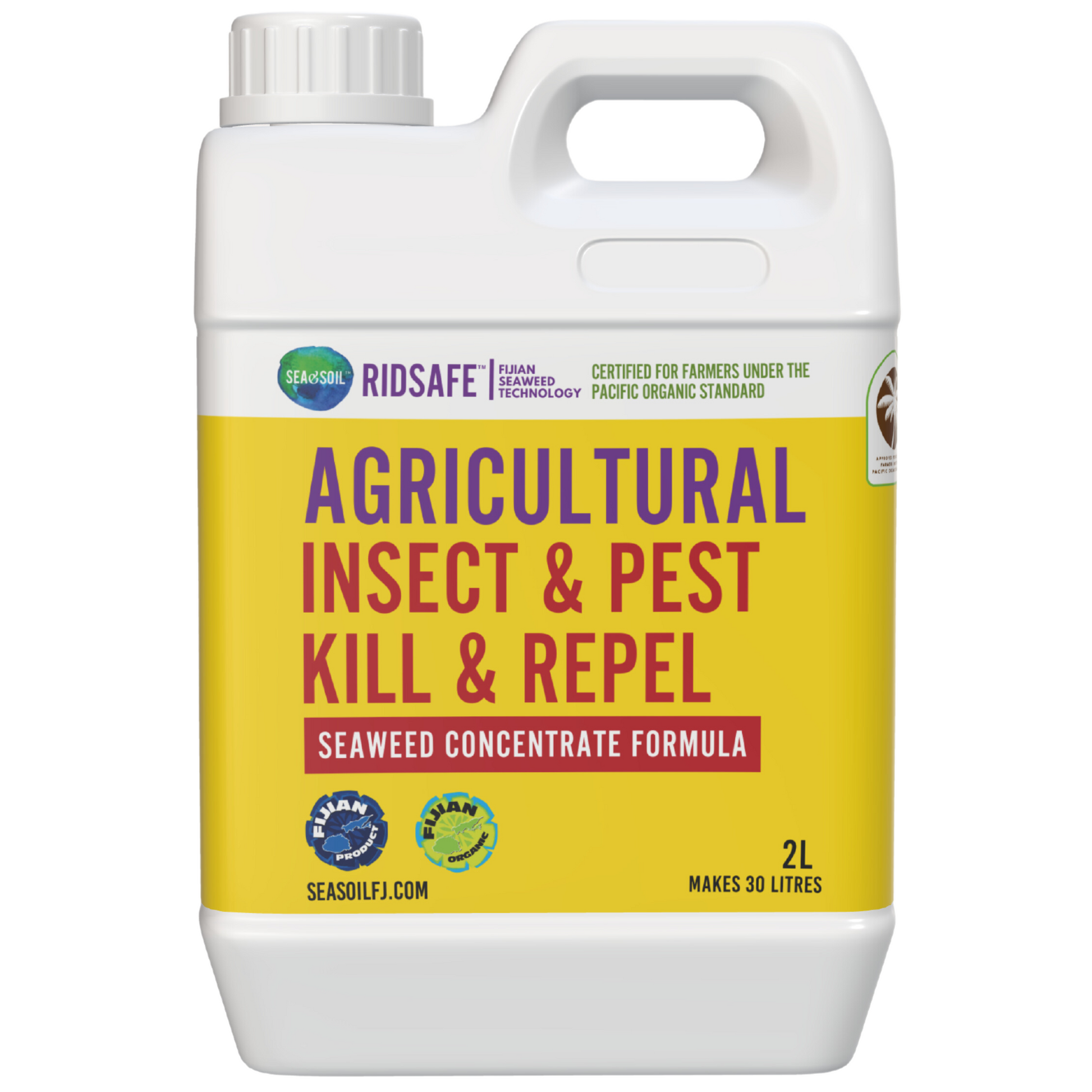 RidSafe Agricultural Insect & Pest Control is an effective and certified organic pesticide designed to protect seaweed crops against a wide range of pests. This pesticide is made in Fiji and is specifically formulated to target over 80 insect species and fungi that can damage crops. This organic pesticide is particularly effective in repelling soil-based pests such as the soil snail and Dalo Beetle, as well as ants and ant colonies. It also helps to repel common garden pests including scales, spider mites, aphids, whiteflies, snails, mites, milibugs, caterpillars, ticks, mosquito breeding sites, termites, and earwigs. The fast-acting formula of RidSafe often provides visible results within the first 1-2 weeks of application.